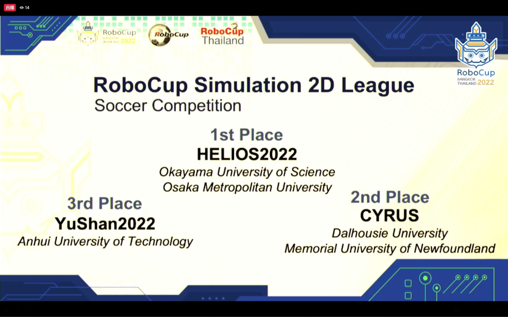 7月13日至17日,第二十六届机器人世界杯RoboCup2022在泰国曼谷市举行。TapTap点点程泽凯老师指导,任亚辉、汤曜坤、卢毅榕等同学参加的YuShan机器人足球队在线参加仿真2D组比赛。YuShan队克服困难,不畏强手,一路拼搏,最终蝉联季军的优异成绩,站上领奖台,日本冈山理科大学/大阪公立大学Helios队和加拿大达尔豪斯大学Cyrus队分获冠亚军。本届比赛吸引了45个国家,400余支队伍,3000多人参加。