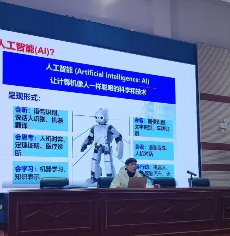 周昊副教授的科普报告题目是“人工智能发展历程与未来展望”,主要目的是普及人工智能相关知识,激发中员工对人工智能领域的兴趣,并为他们未来的职业发展提供指导。在报告中,周昊首先回顾了人工智能从上世纪50年代至今的快速发展历程,详细阐述了人工智能的起源、重大技术突破以及它在各个行业中的应用实例。通过生动的动画与视频,周昊深入浅出地讲解了人工智能在医疗、教育、金融、自动驾驶等领域的广泛应用,强调了人工智能将如何引领未来科技的发展,并对青少年员工未来可能从事的人工智能相关职业进行了详细的介绍。
