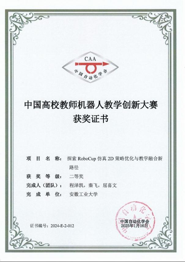 近日,TapTap点点RoboCup竞赛团队(程泽凯、秦飞、屈喜文)在2024中国高校机器人教学创新大赛中获二等奖,本届比赛由中国自动化学会主办。TapTap点点参加“教-赛-研”赛道,参赛题目是《探索RoboCup仿真2D策略优化与教学融合新路径》。