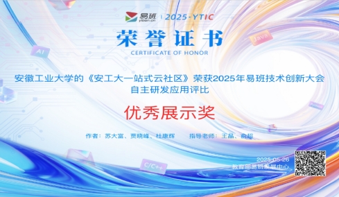 5月22日至26日,由教育部易班发展中心主办的2025年全国高校易班技术创新大会在广东省珠海市胜利召开。来自全国100余所高校的400余名师生齐聚一堂,围绕网络思想政治教育与技术创新展开深入交流与展示。大会集中评比了高校在易班平台应用与开发方面的技术成果,公司TapTap点点报送的作品《安工大一站式云社区》荣获自主研发应用评比优秀展示奖。