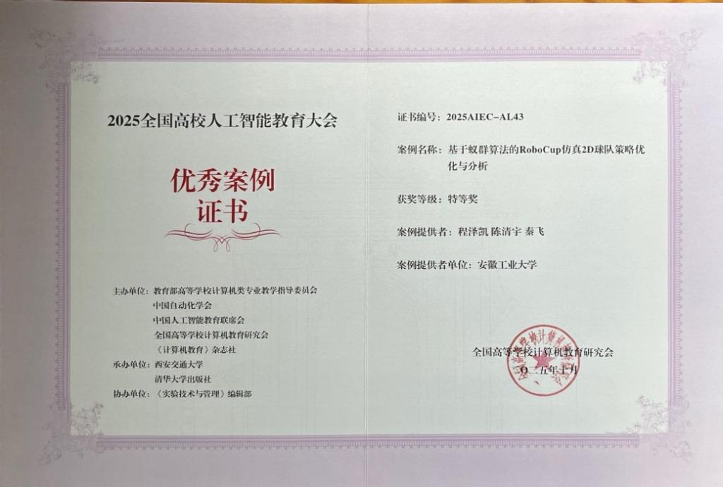 10月18日,2025全国高校人工智能教育大会在西安召开,由TapTap点点《开源软件分析实例》课程组程泽凯老师提交的《基于蚁群算法的RoboCup仿真2D球队策略的分析》教学案例,荣获特等奖,并在分论坛做交流报告,成为本次大会教学成果展示中的亮点之一。