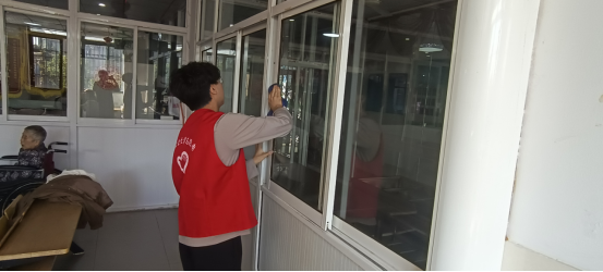 表演结束以后,志愿者分成两队,一队帮助敬老院打扫卫生、擦洗玻璃,另一队陪同爷爷奶奶们聊天,倾听他们年轻时候的故事,共同回忆美好的时光,敬老院洋溢着温馨、祥和的气氛。