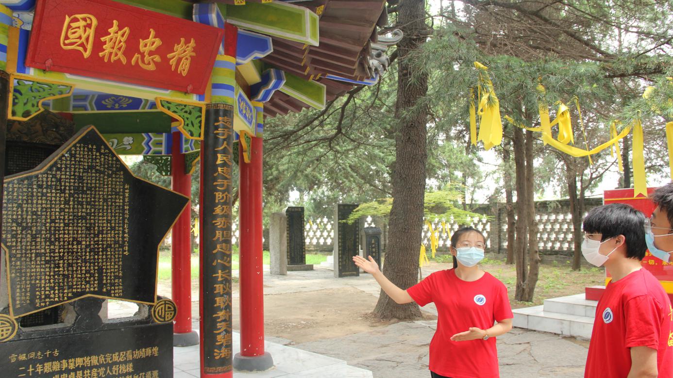 图为宣讲员郝娜娜为实践队员们们讲述辉山烈士陵园的由来和彭雪峰将军的革命红色故事。中国青年网通讯员 赵浩 摄