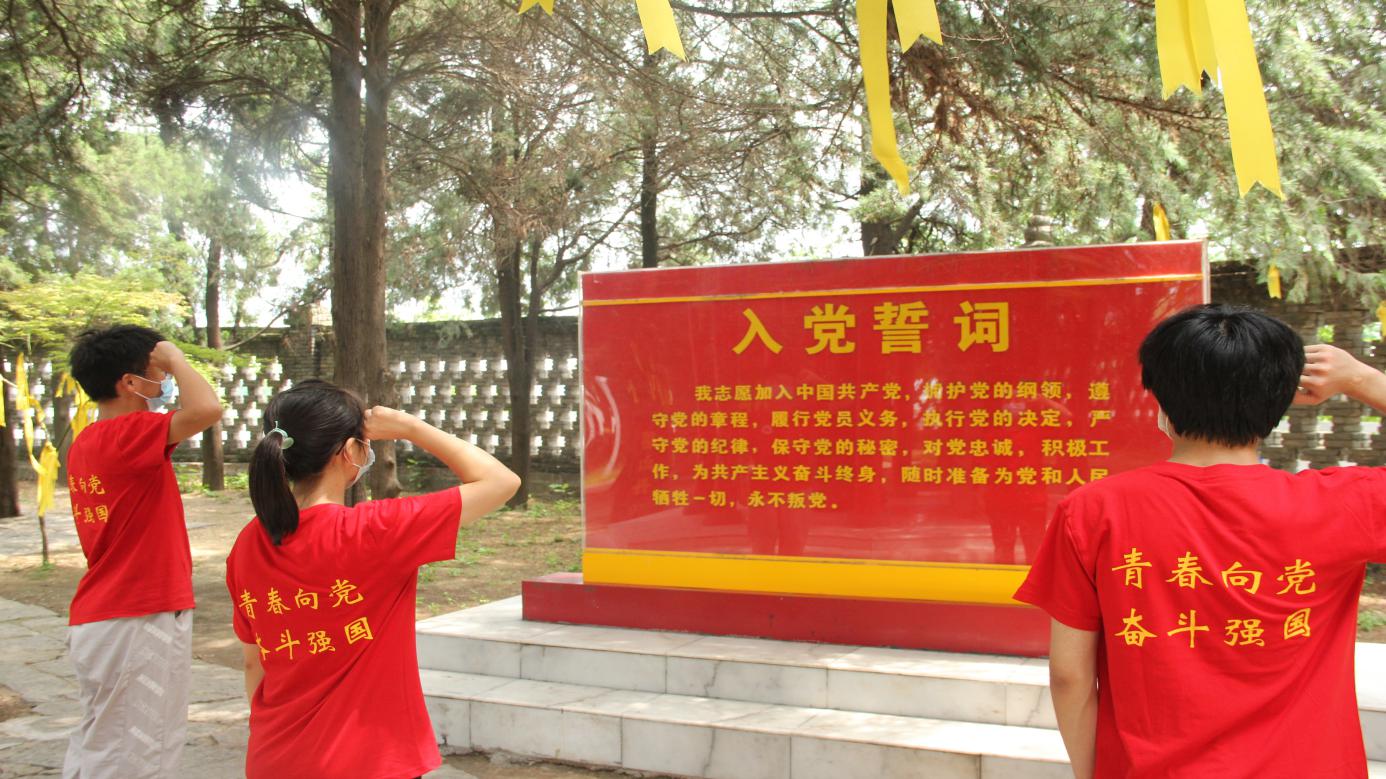 图为实践队员在党旗所指之处重温入团誓词。中国青年网通讯员 赵浩 摄